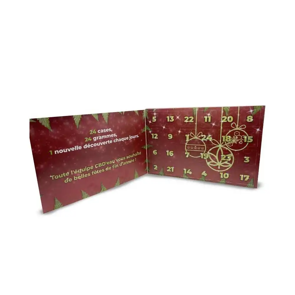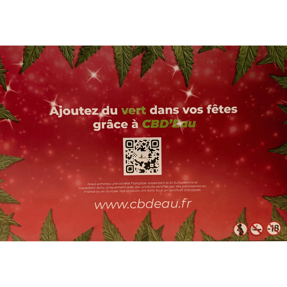 Plus de 24 grammes de fleurs CBD et résines CBD dans le calendrier ! Une autre surprise vous attend à l'achat de notre calendrier de l'avent CBD'eau.