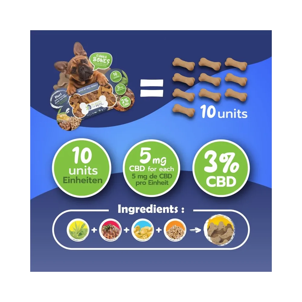 Chaque paquet offre 10 bouchées savoureuses combinant de la viande, des pommes de terre et des céréales, chacune renfermant 3% de CBD, soit 5 mg par gourmandise.