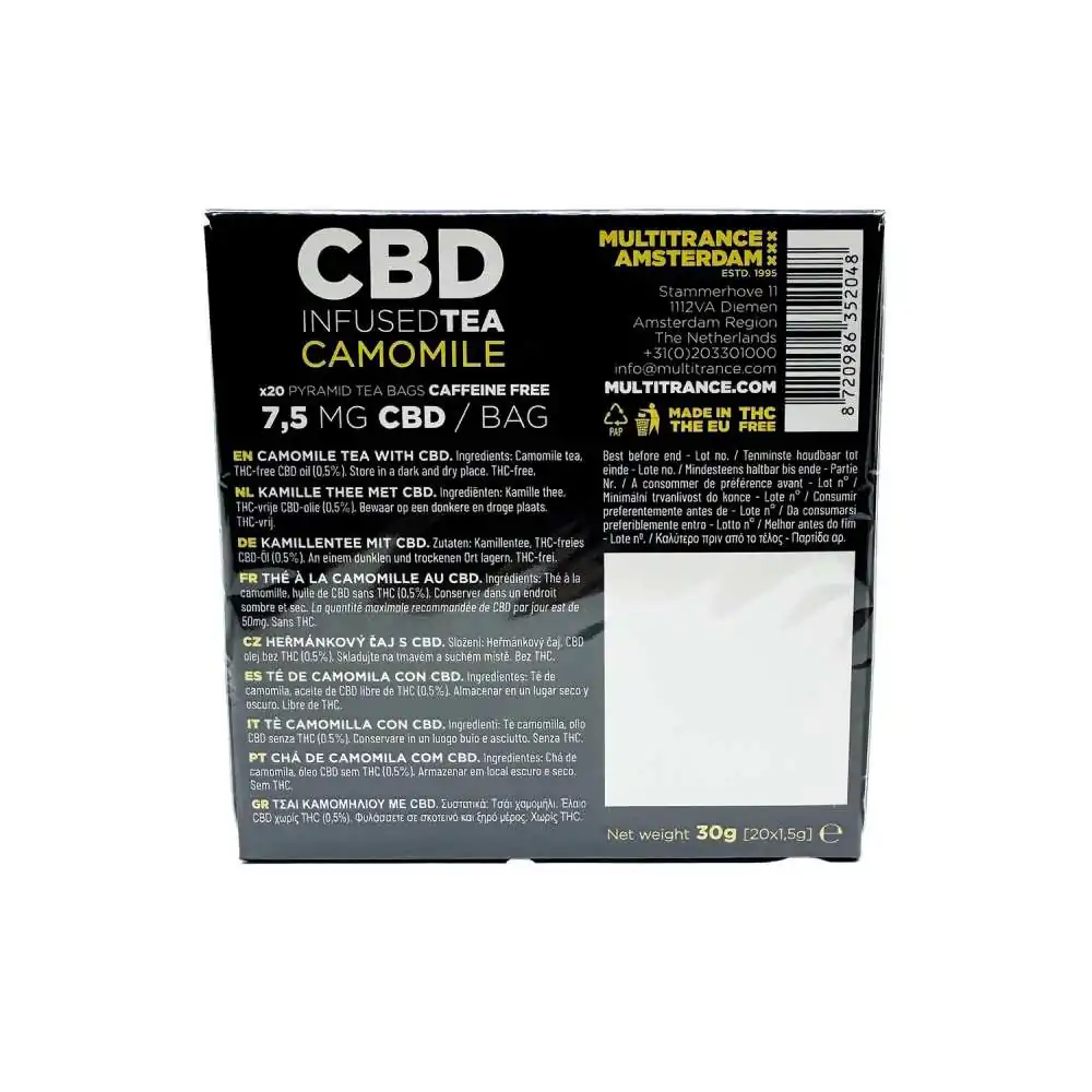 Le Thé Camomille CBD Multitrance propose des bienfaits apaisants de la camomille pour une expérience de détente incomparable. Chaque sachet pyramide contient un mélange parfait de fleurs de camomille délicates et 7,5 mg de CBD pur, offrant une infusion douce et réconfortante.